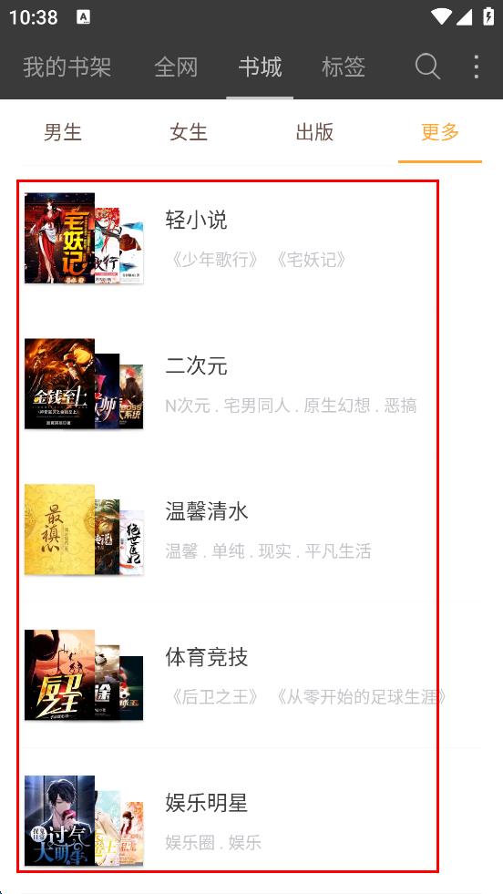 4、若在“男生”“女生”“出版”分類中未找到心儀書籍,點擊“更多”分類,這里有“輕小說”“二次元”“體育競技”等更多類型,從中挑選喜歡的書籍進行閱讀。