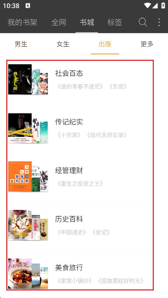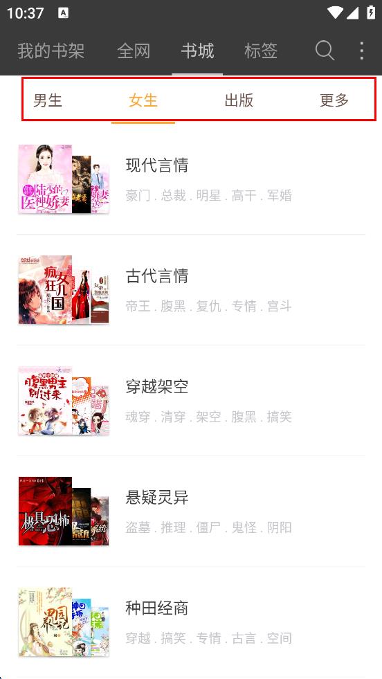 2、進入書城頁面,可看到有“男生”“女生”“出版”“更多”等分類選項,可先從這些分類中初步篩選書籍類型。