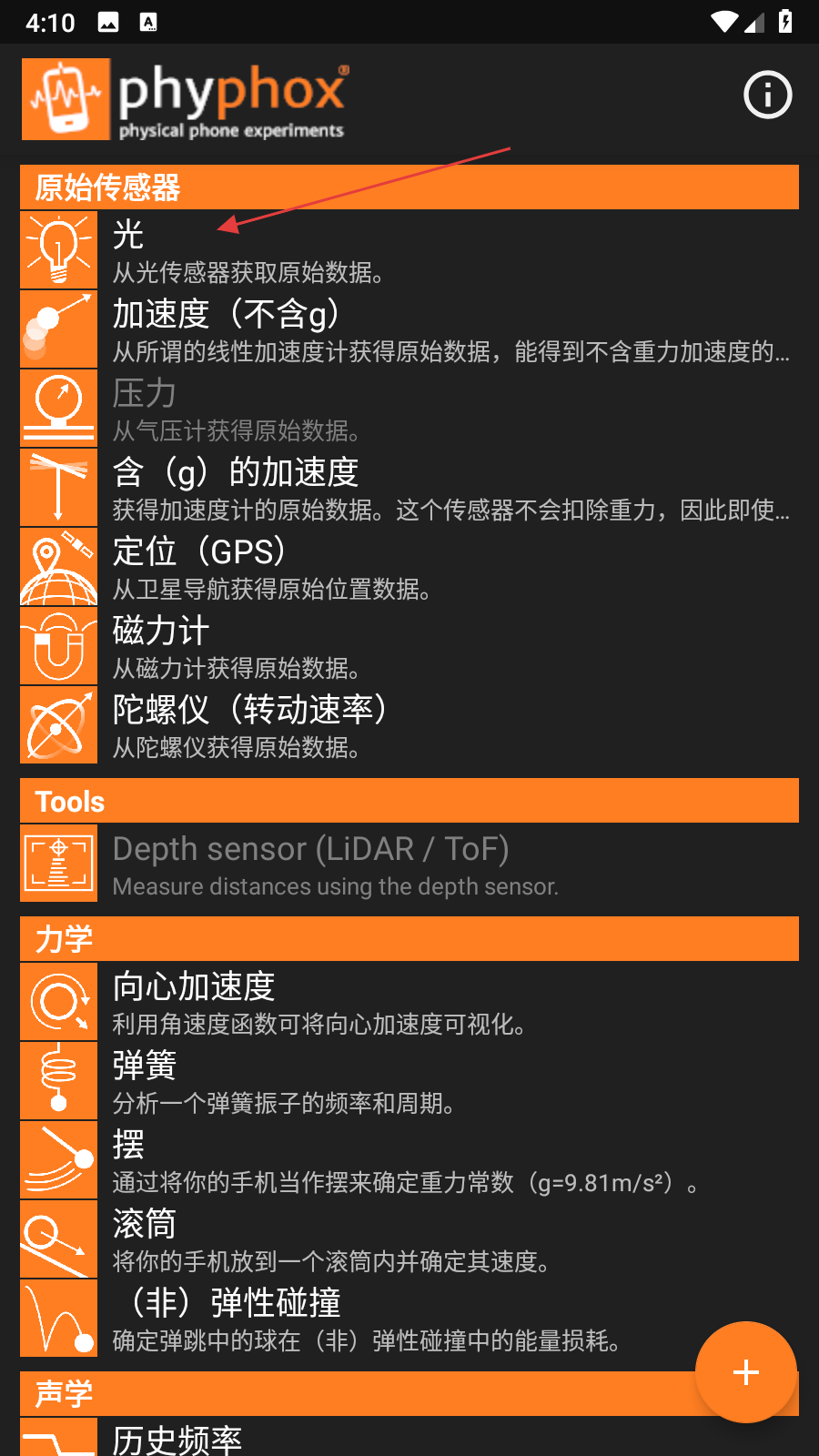 1、打開物理工坊應(yīng)用,在傳感器板塊中選擇要導(dǎo)出的實驗,比如點擊光選項,進入光傳感器實驗界面。
