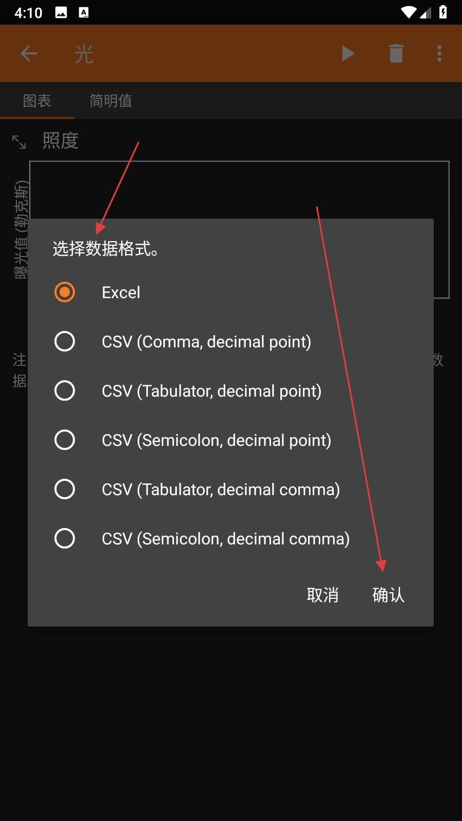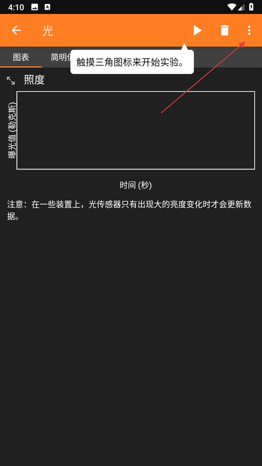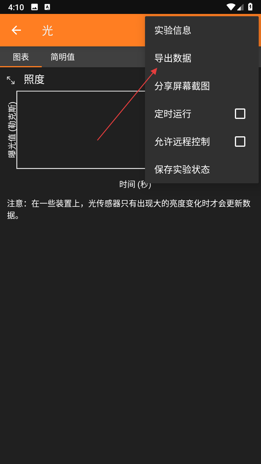 2、在光傳感器實驗界面右上角,點擊三點圖標(biāo),彈出功能菜單。