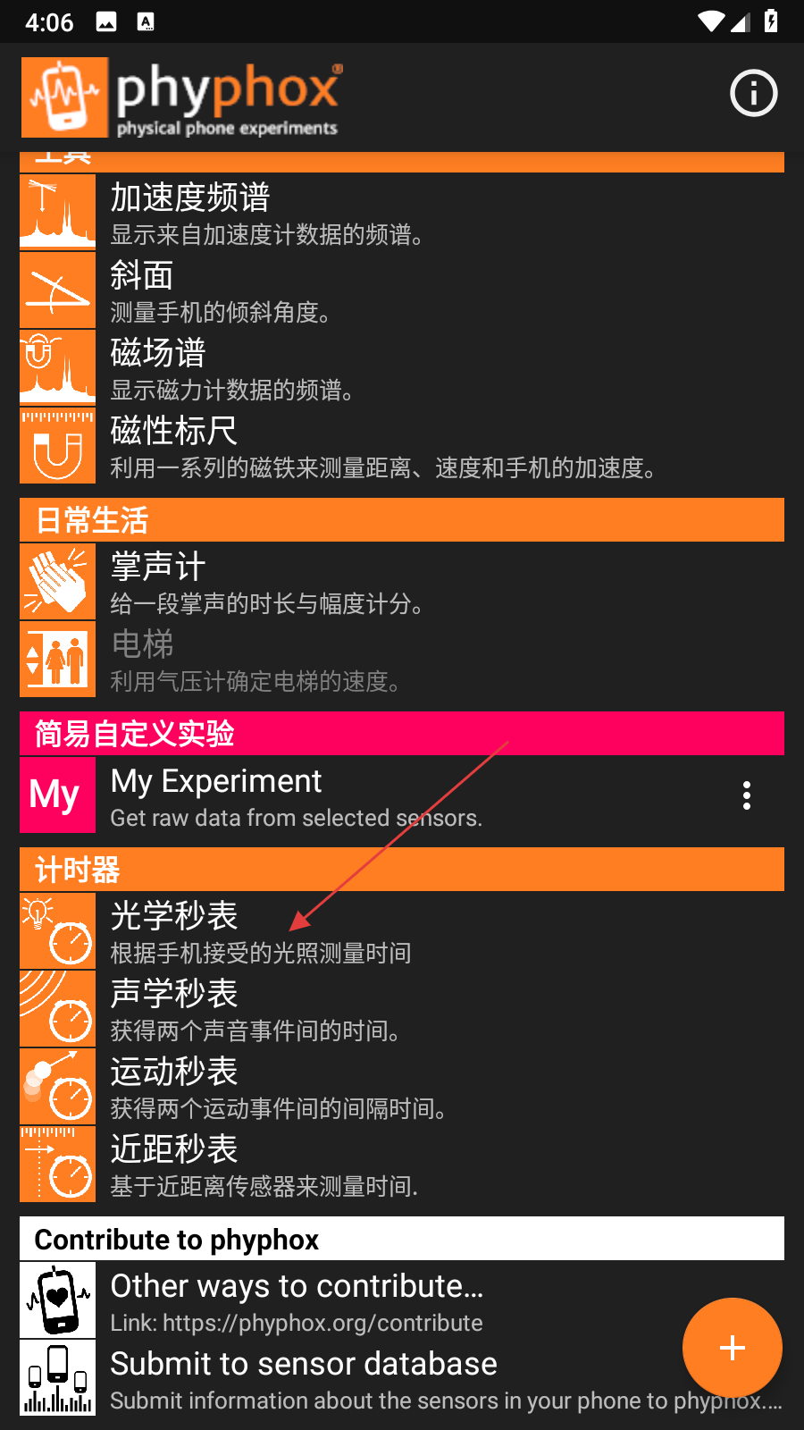 1、打開手機物理工坊應(yīng)用,在主界面找到計時器分類,點擊對應(yīng)秒表功能,進入秒表設(shè)置界面。