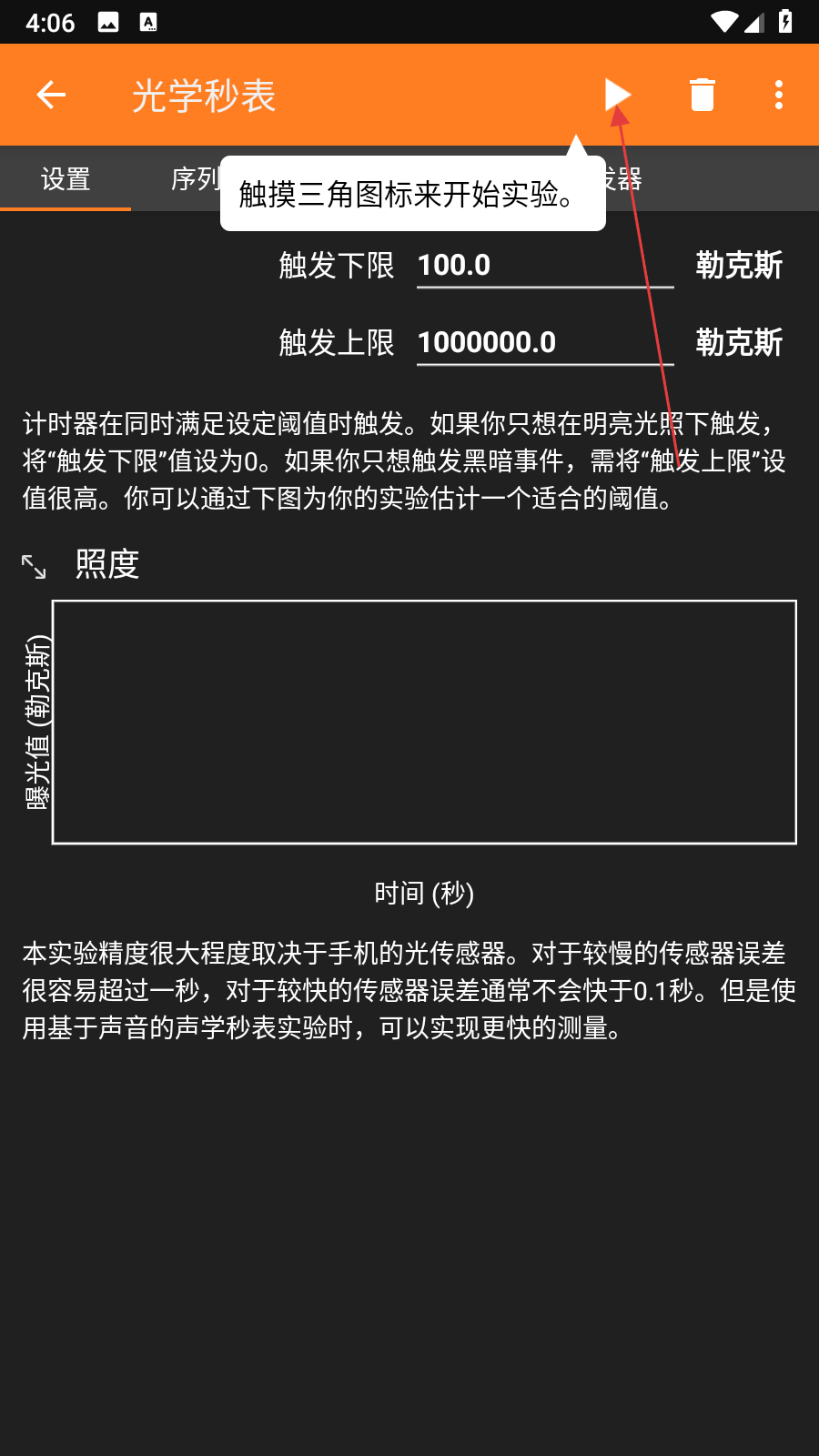 2、在秒表設(shè)置界面,根據(jù)需求調(diào)整觸發(fā)下限,觸發(fā)上限等參數(shù),完成參數(shù)設(shè)置,然后點擊界面上方的三角播放圖標開始實驗。