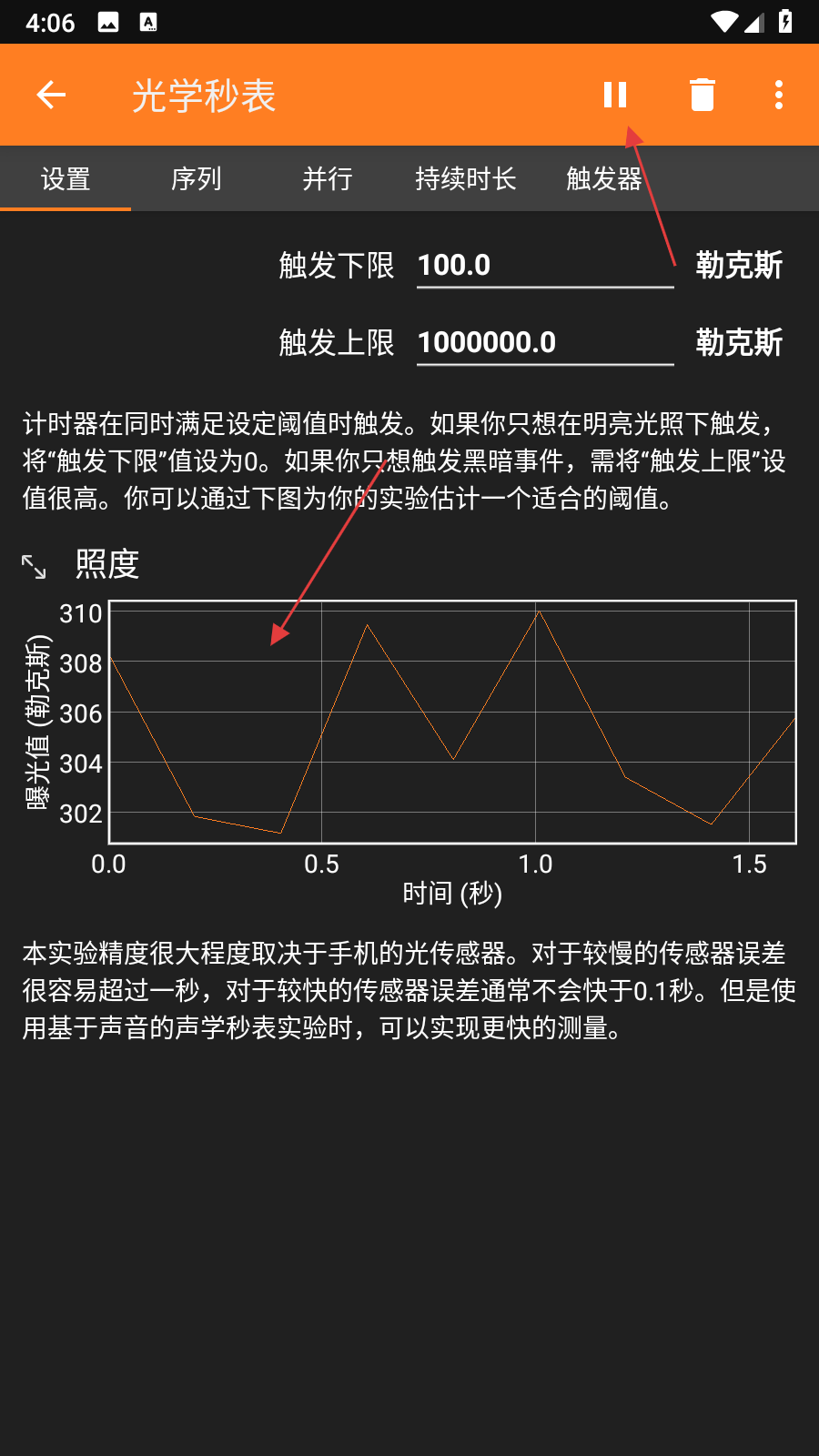 3、秒表將根據(jù)設(shè)定條件觸發(fā)計時,實驗過程中可查看數(shù)據(jù)圖表,若需暫停點擊暫停圖標,結(jié)束實驗可點擊停止或垃圾桶圖標。