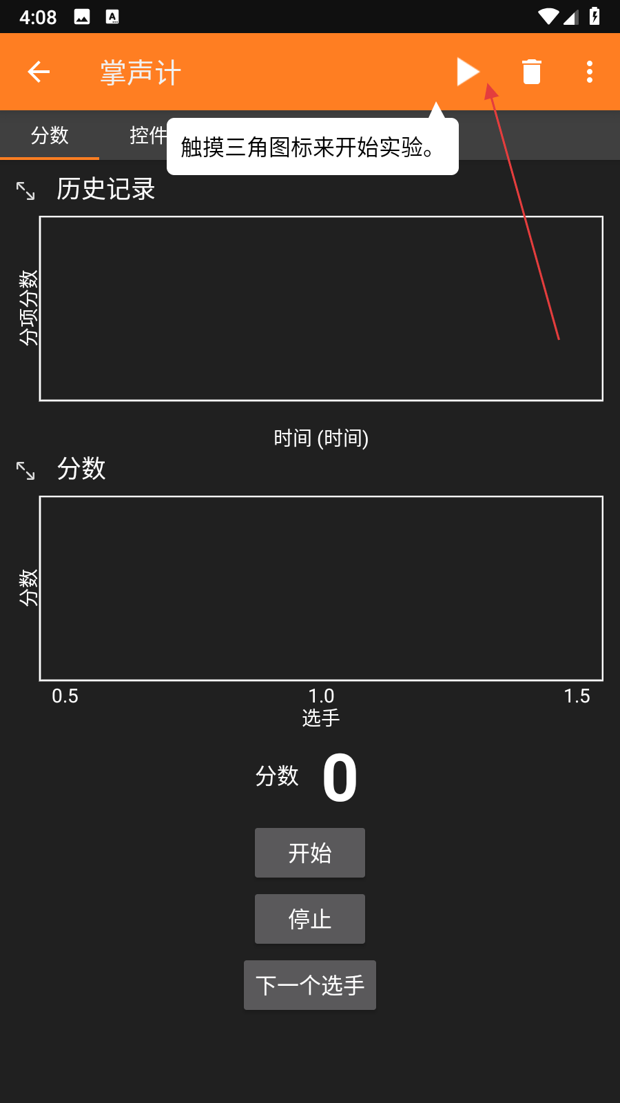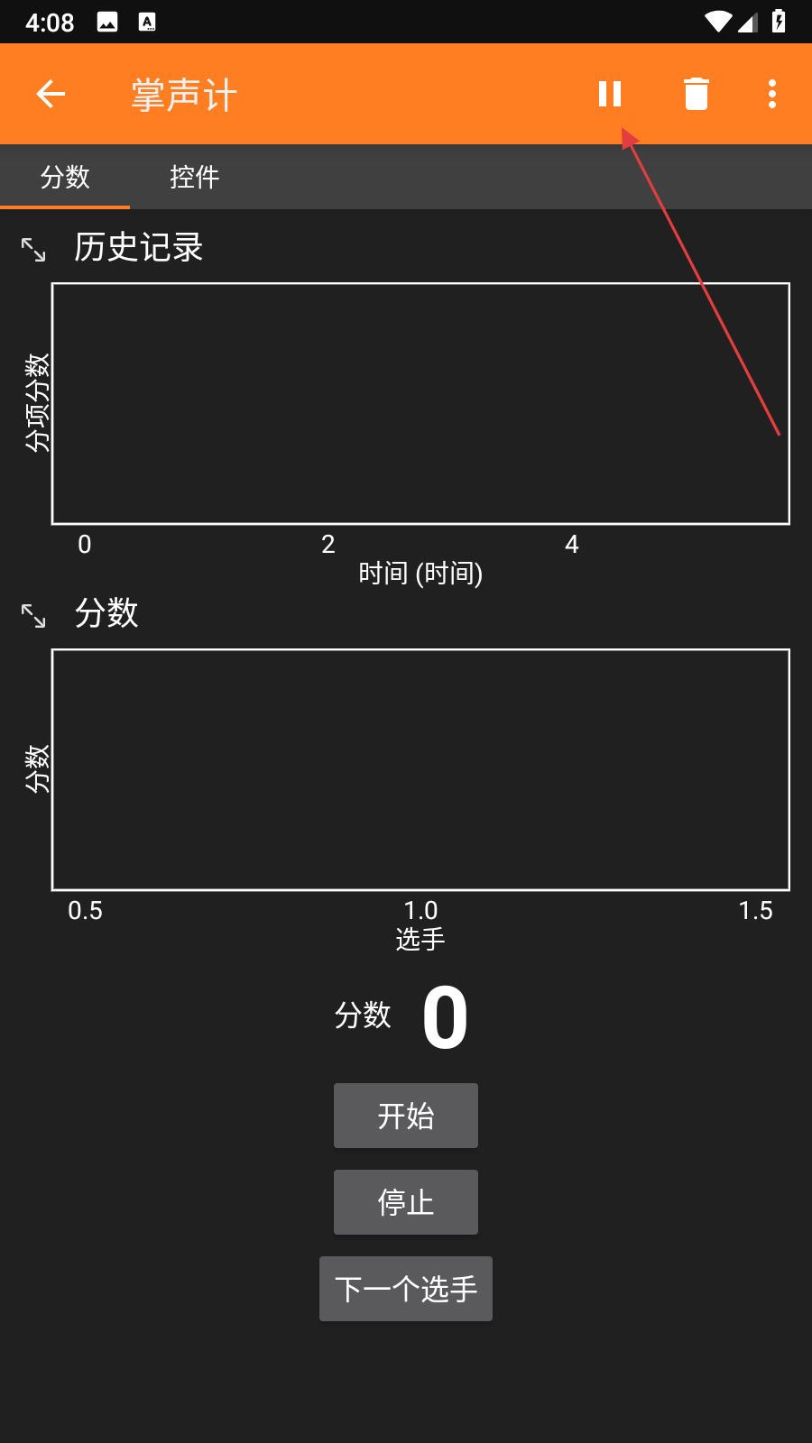 3、實(shí)驗(yàn)過(guò)程中可點(diǎn)擊暫停圖標(biāo)暫停計(jì)時(shí),結(jié)束后查看歷史記錄圖表和分?jǐn)?shù)顯示,若需切換選手點(diǎn)擊下一個(gè)選手按鈕,繼續(xù)為其他選手的掌聲計(jì)分。