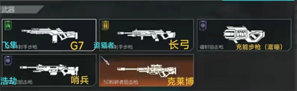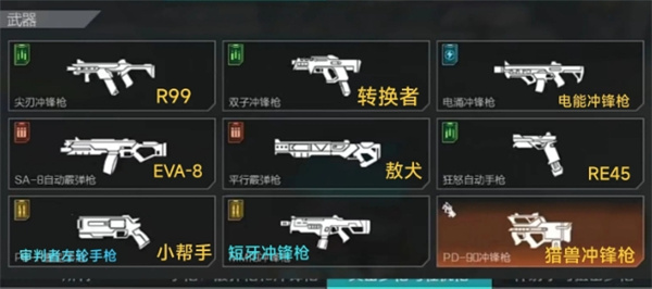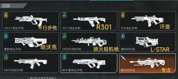 ② 槍械:GK47、飛隼、 R117、B16、蓄能突擊、M401、脈沖星、雷獸、尖刃、雙子、PD-90、短牙、星粒、颶風、煉獄、SA-8、鐳射、浩劫、狂怒以及電涌。