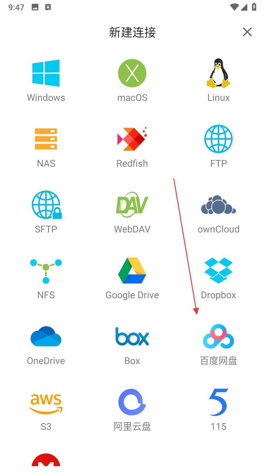 3、在新建連接界面,找到并點(diǎn)擊百度網(wǎng)盤圖標(biāo)。