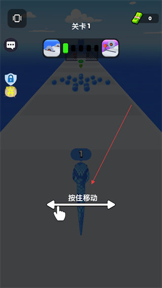 1、進(jìn)入游戲后,按住屏幕左右移動控制蛇的方向。