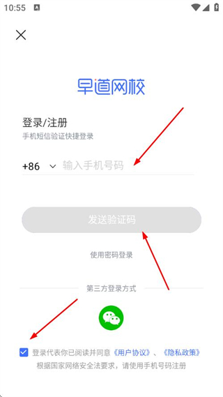 3、輸入手機號碼,勾選用戶協(xié)議后,點擊發(fā)送驗證碼。