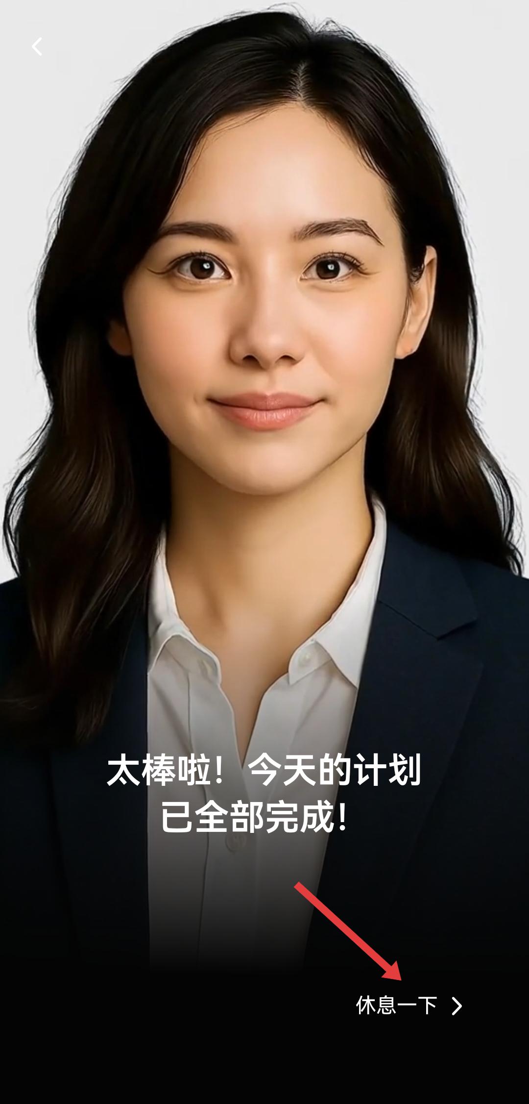 4、完成當(dāng)日單詞學(xué)習(xí)計(jì)劃后,點(diǎn)擊休息一下,結(jié)束本次背單詞任務(wù)。