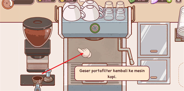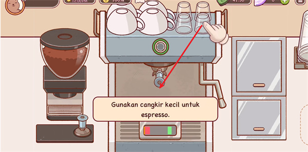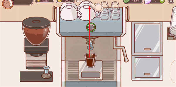 6、在進(jìn)行咖啡液萃取的過程中,玩家將需要從上方拿取一個(gè)玻璃杯放下來;