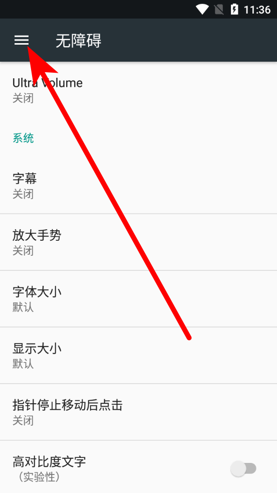 2、在無障礙界面,點(diǎn)擊左上角菜單圖標(biāo)。
