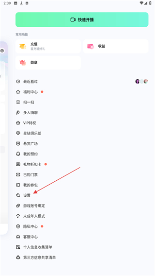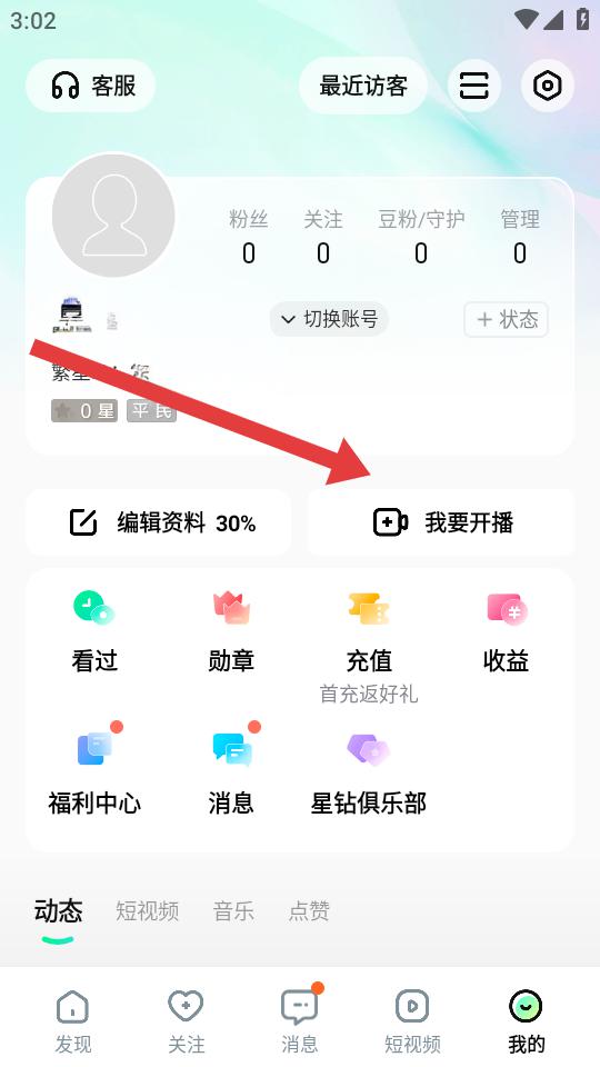 1、打開酷狗直播APP,進入我的頁面后,點擊我要開播的按鈕,彈出開播相關的選項。