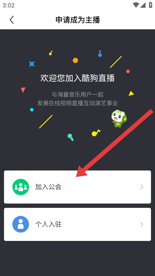 3、進入申請成為主播頁面后,選擇個人入駐,隨后按照提示完成認證等操作,即可開通酷狗直播權限。