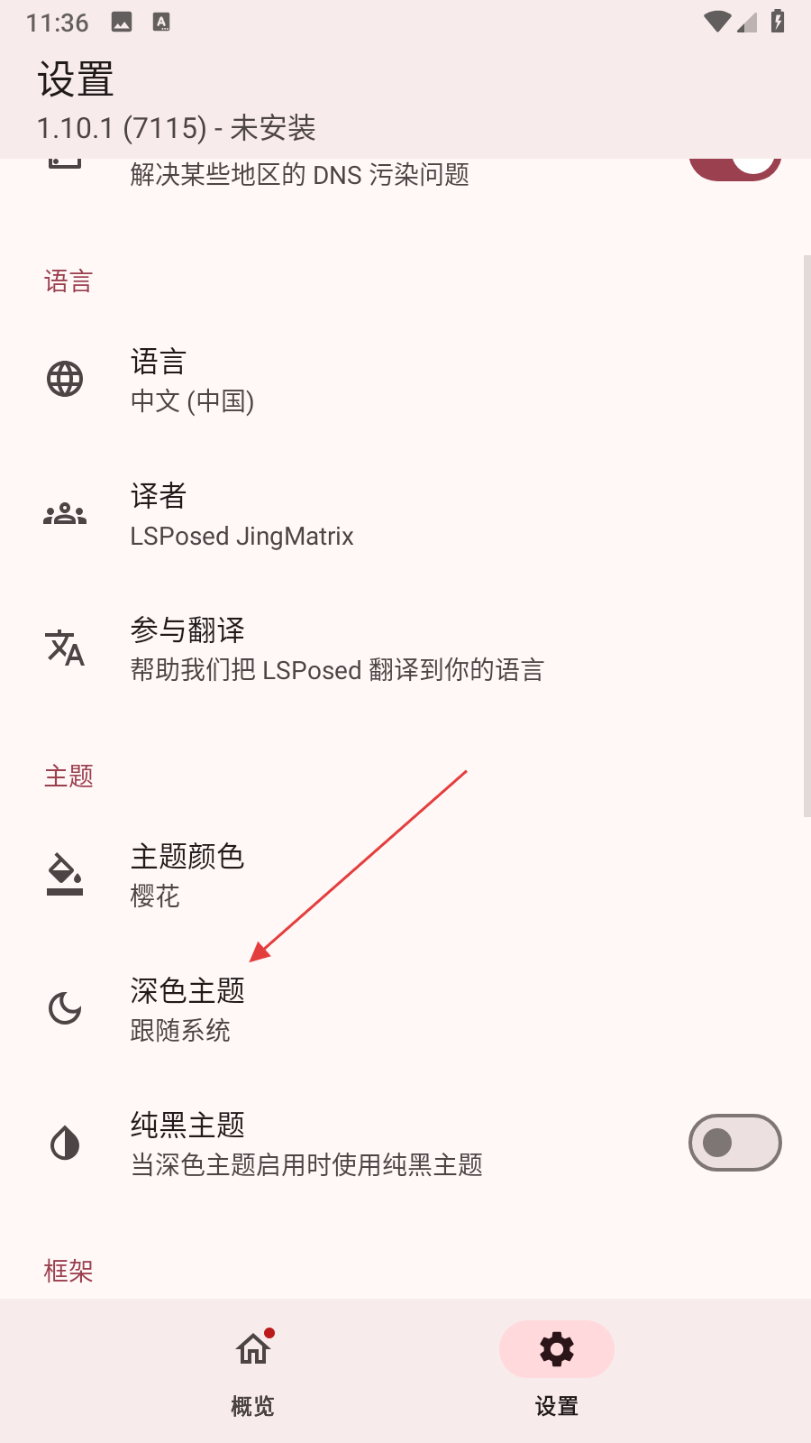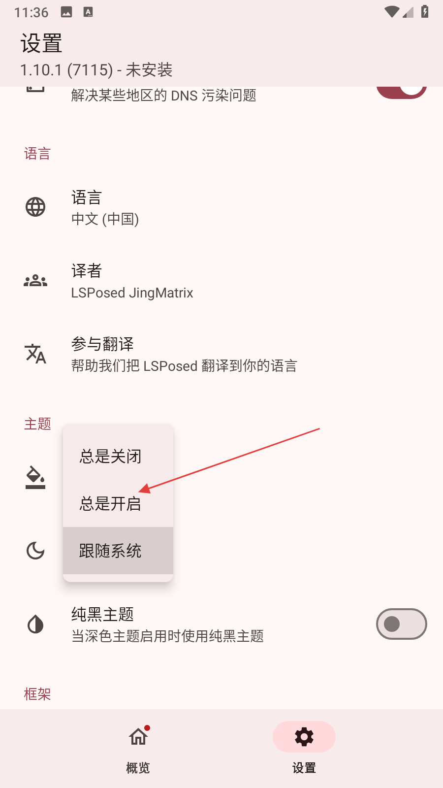2、在設(shè)置頁面中,找到深色主題選項(xiàng)并點(diǎn)擊,彈出選擇列表,從中選擇總是開啟,將深色主題設(shè)置為始終開啟狀態(tài)。