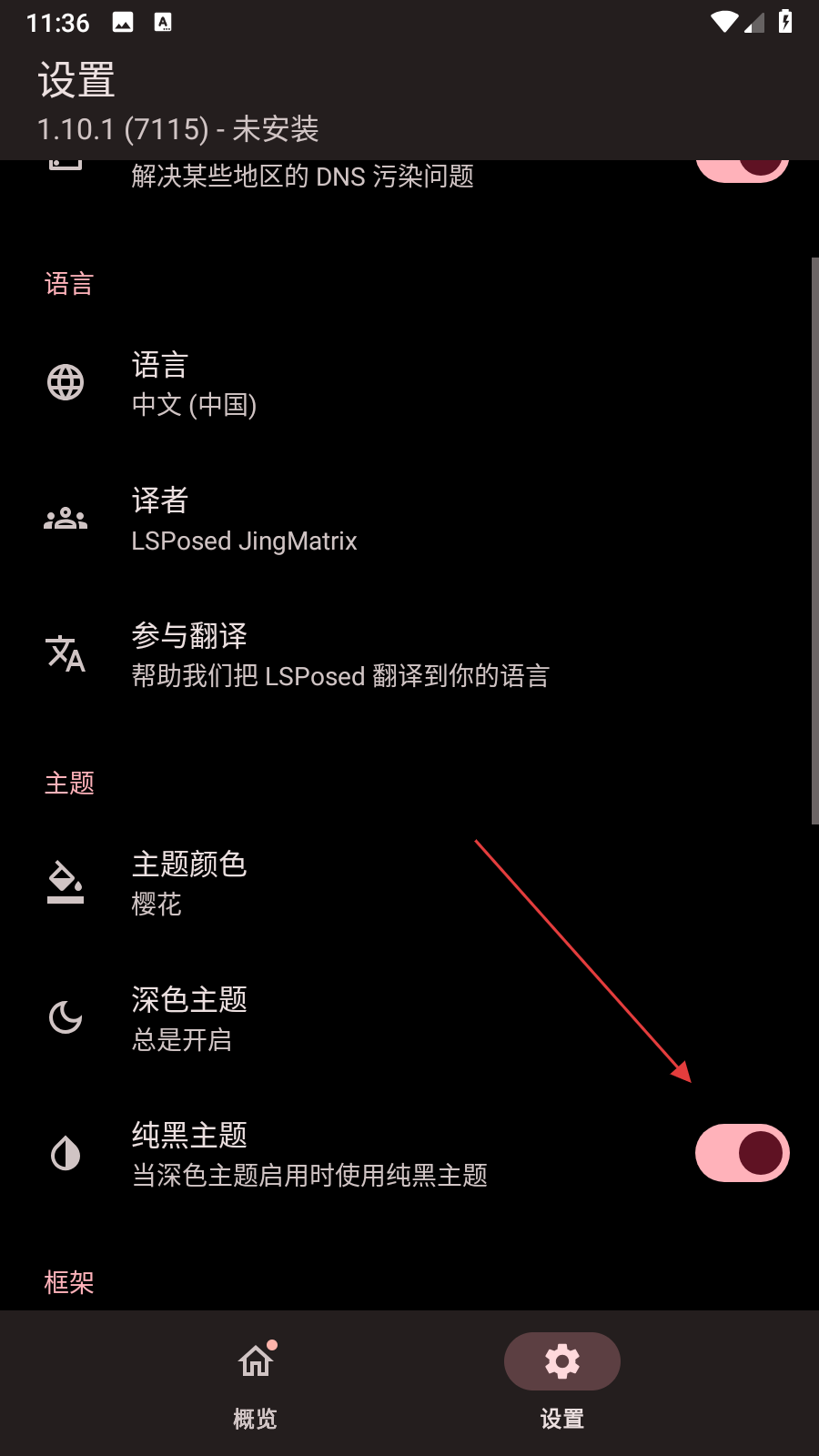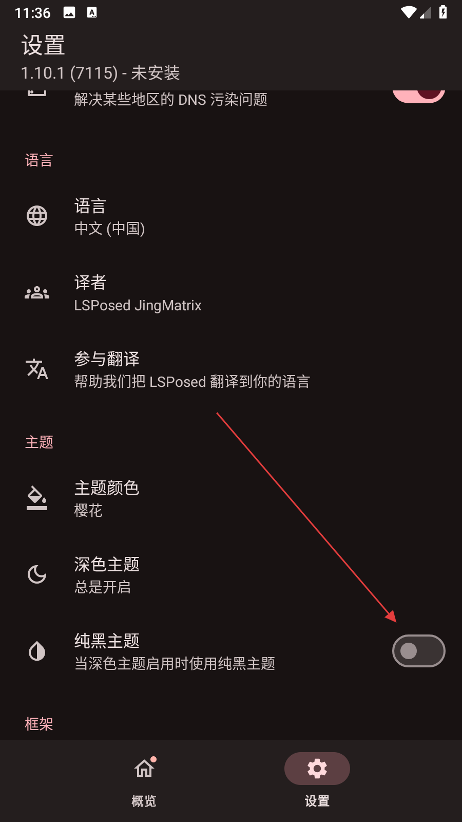 3、深色主題開啟后,在設(shè)置頁面中找到純黑主題選項(xiàng),點(diǎn)擊其右側(cè)的開關(guān)按鈕,把開關(guān)切換到開啟狀態(tài)。