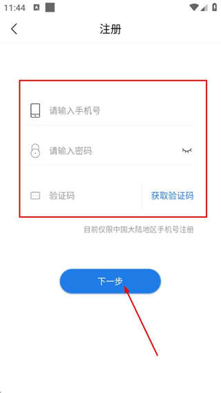 4、輸入手機(jī)號、密碼,輸入驗證碼后點擊下一步,完成賬號注冊。