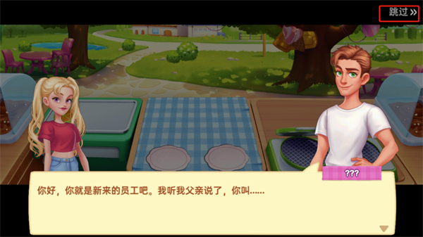 1、順利的進(jìn)入到制作的攤位之上后,將會(huì)有老板的兒子來和你介紹冰淇淋的制作辦法,不想觀看對(duì)話可以點(diǎn)擊屏幕右上角的【跳過】;