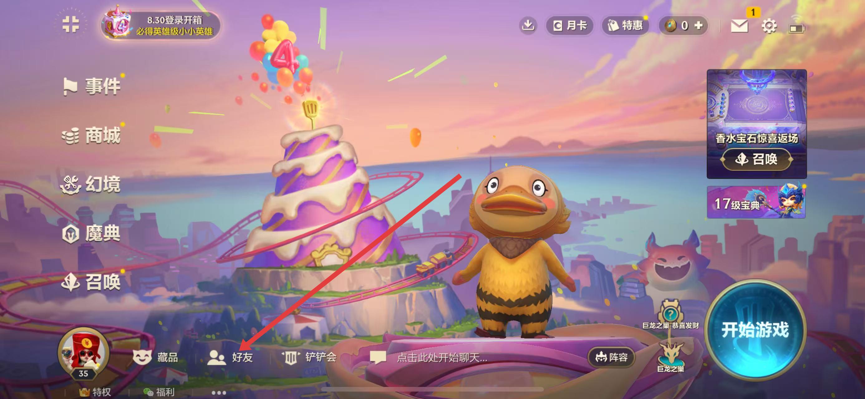 1、打開金鏟鏟之戰(zhàn)游戲,進入主界面,點擊下方菜單欄中的好友選項,進入社交界面。