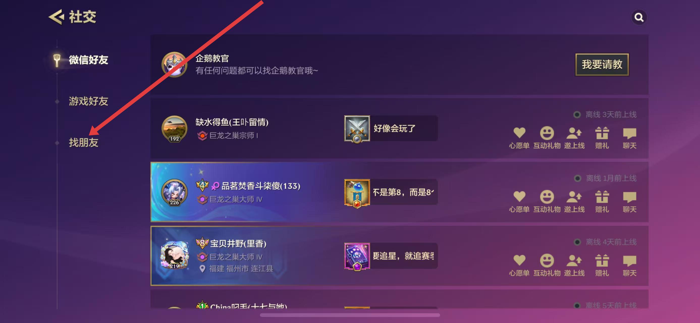 2、在社交界面,點擊左側(cè)列表中的找朋友,切換到尋找好友的頁面。