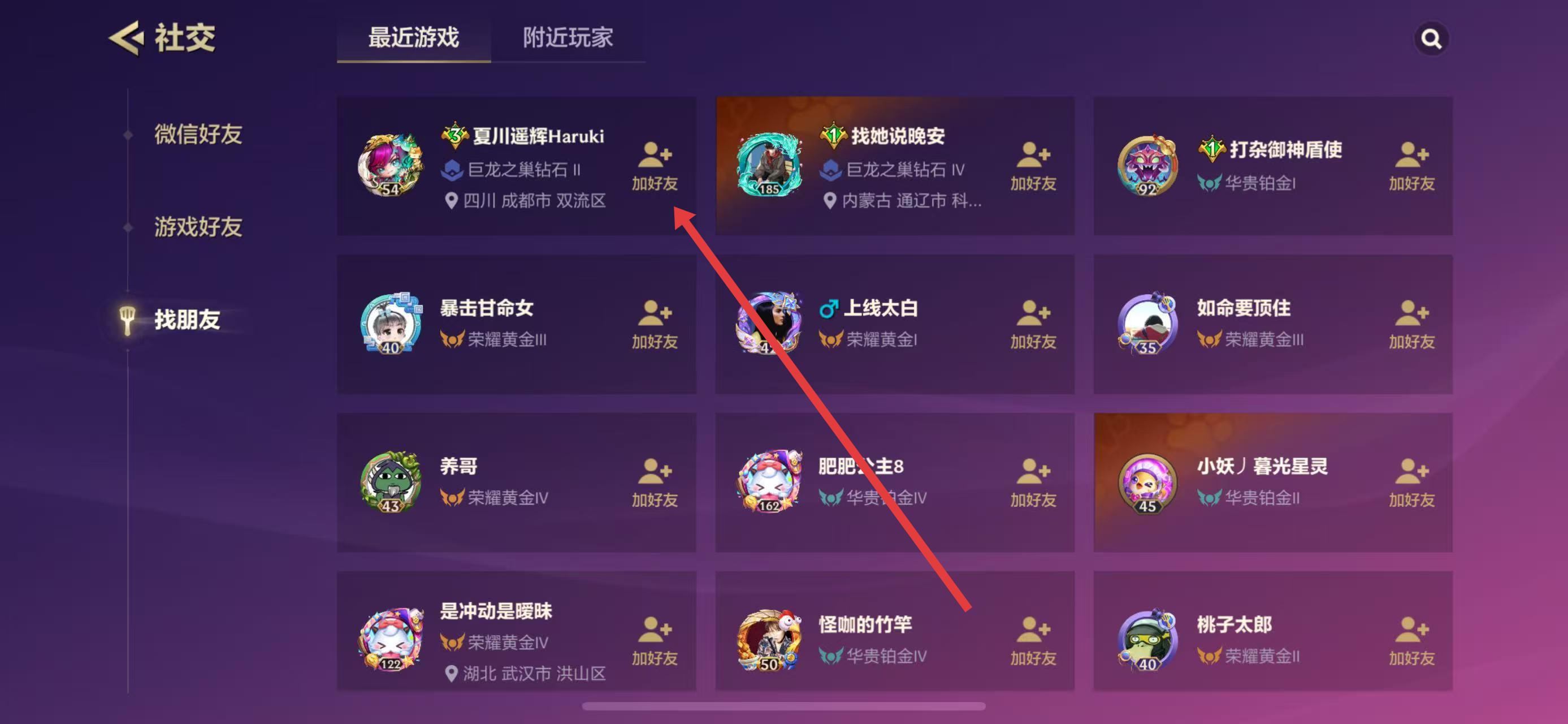 3、在找朋友頁面,會顯示最近游戲的玩家或附近玩家,找到想添加的好友,點擊其頭像旁的加好友按鈕,等待對方通過即可。