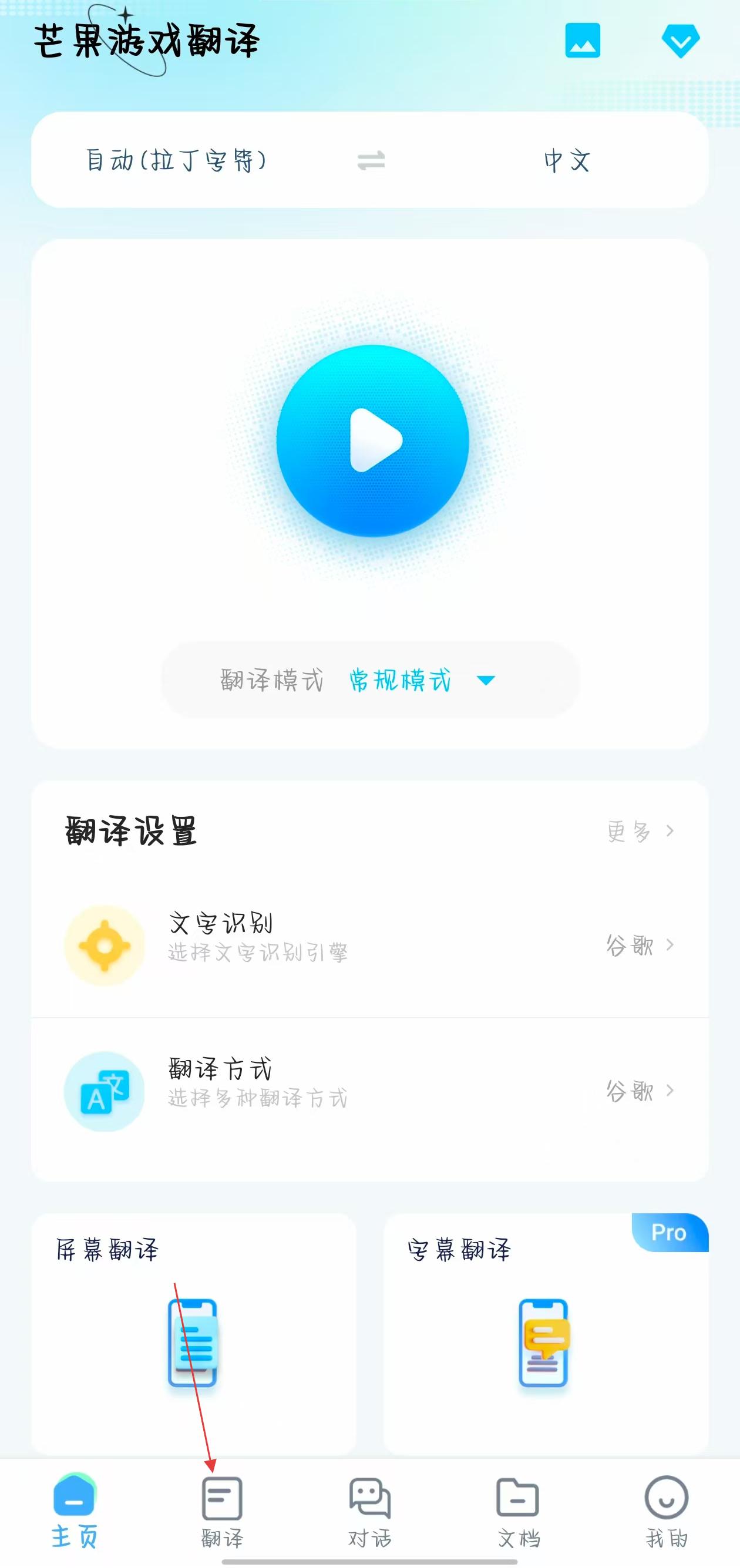 1、打開芒果游戲翻譯應(yīng)用,點擊底部導(dǎo)航欄里的翻譯選項,進入文本翻譯界面。