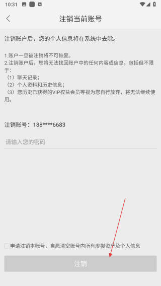 4、在注銷當(dāng)前賬號頁面,輸入賬號密碼,勾選同意相關(guān)協(xié)議后,點(diǎn)擊注銷按鈕。