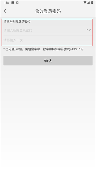 4、驗(yàn)證通過后,輸入新的登錄密碼并點(diǎn)擊確認(rèn)即可。