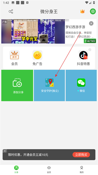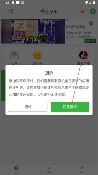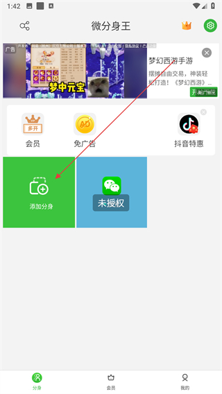 1、打開微分身王應(yīng)用,在首頁點(diǎn)擊綠色的添加分身按鈕,觸發(fā)權(quán)限提示彈窗。