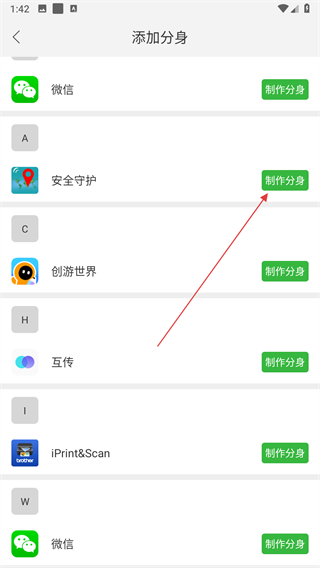3、進(jìn)入添加分身頁面后,找到目標(biāo)應(yīng)用,點(diǎn)擊其右側(cè)對應(yīng)的制作分身按鈕。