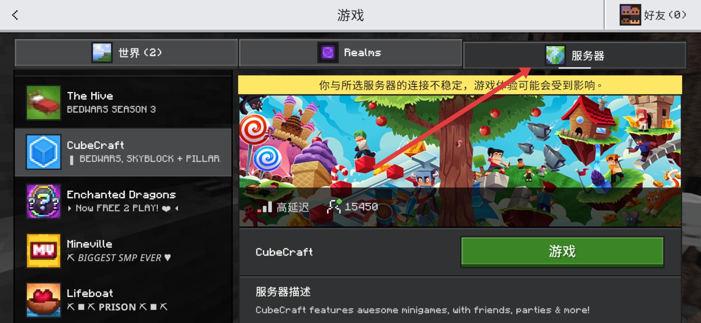 1、打開我的世界游戲的主界面,點擊頂部服務(wù)器標(biāo)簽,進(jìn)入服務(wù)器列表頁面,查看可選的在線服務(wù)器。