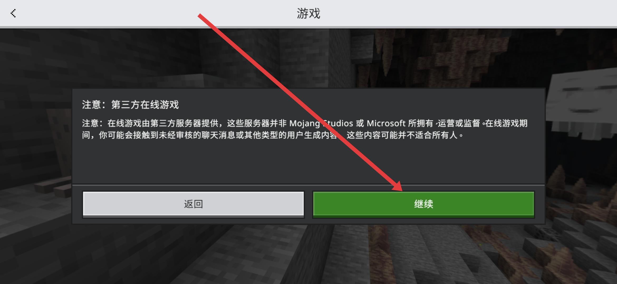 2、后續(xù)可能會彈出第三方服務(wù)器的提示框,需要閱讀提示后點擊繼續(xù),確認(rèn)進(jìn)入在線服務(wù)器的模式。