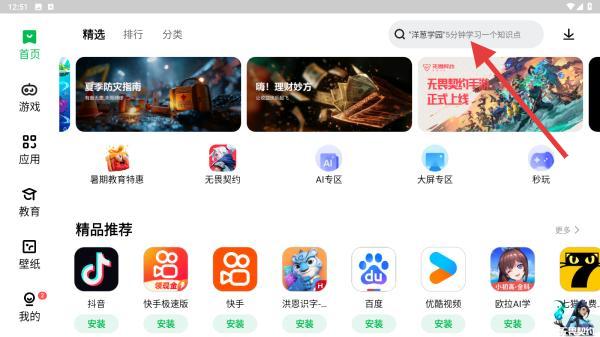 1、打開聯(lián)想應(yīng)用商店APP,進入主界面后,點擊頂部搜索欄,在搜索欄內(nèi)輸入需安裝的軟件名稱如快手、抖音。