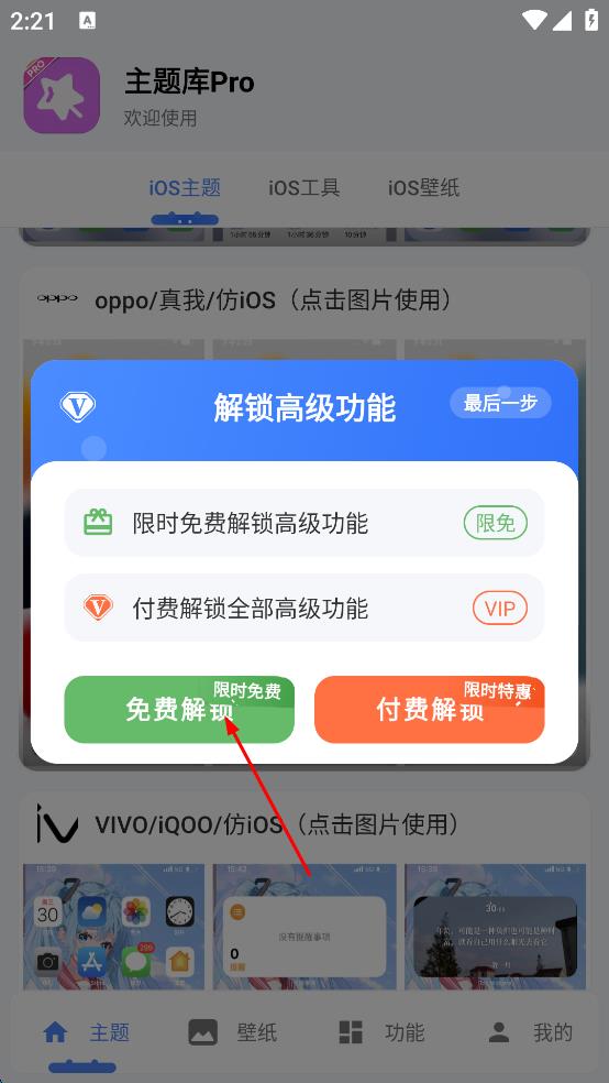 3、若有解鎖高級(jí)功能需求,當(dāng)彈出解鎖高級(jí)功能界面時(shí),點(diǎn)擊免費(fèi)解鎖(限時(shí)免費(fèi))選項(xiàng),嘗試獲取高級(jí)功能使用權(quán)。