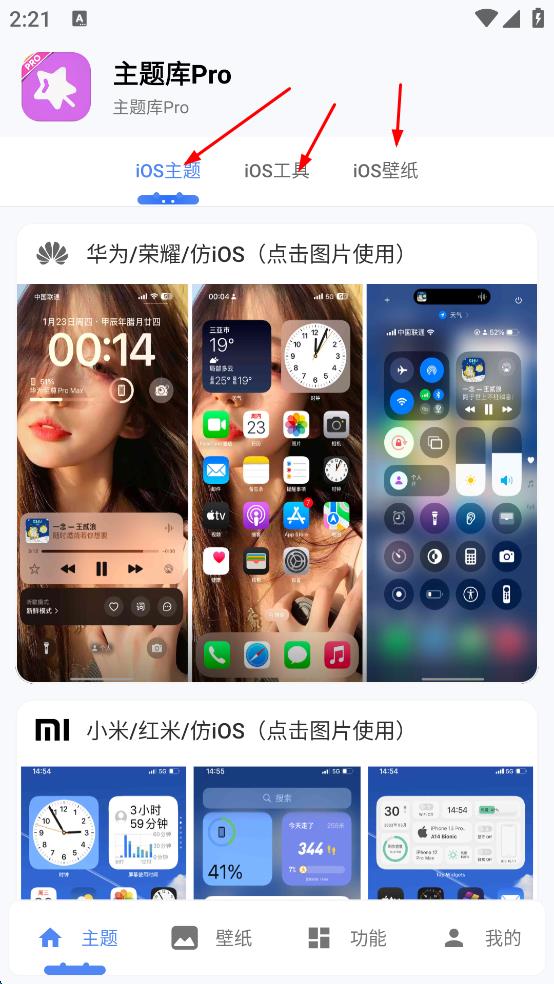 2、在主題庫(kù)Pro主界面,可看到iOS主題、iOS工具、iOS壁紙等選項(xiàng),按需選擇對(duì)應(yīng)的板塊,瀏覽相關(guān)主題內(nèi)容。