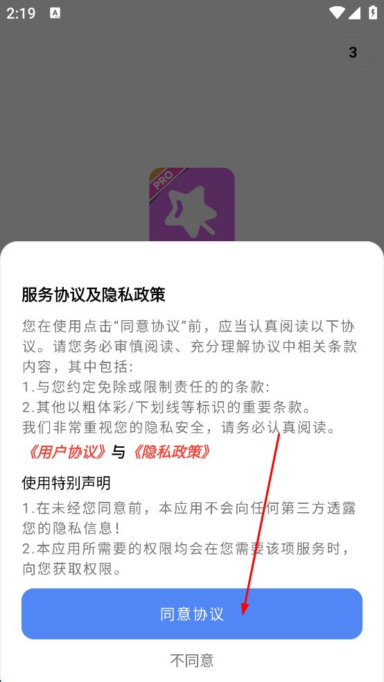 1、打開(kāi)主題庫(kù)Pro應(yīng)用,彈出服務(wù)協(xié)議及隱私政策界面,認(rèn)真閱讀相關(guān)內(nèi)容后,點(diǎn)擊同意協(xié)議,進(jìn)入應(yīng)用主界面。