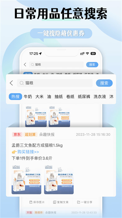 3、為用戶帶來了優(yōu)惠券、精準(zhǔn)搜索及推薦等功能,幫助用戶輕松找到所需商品,省心又省錢。