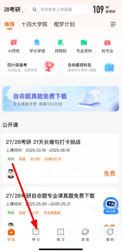 1、打開橙啦APP,點(diǎn)擊底部導(dǎo)航欄中的學(xué)習(xí)選項(xiàng)。
