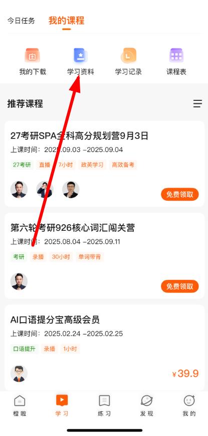 2、在學(xué)習(xí)頁面,點(diǎn)擊學(xué)習(xí)資料選項(xiàng)。