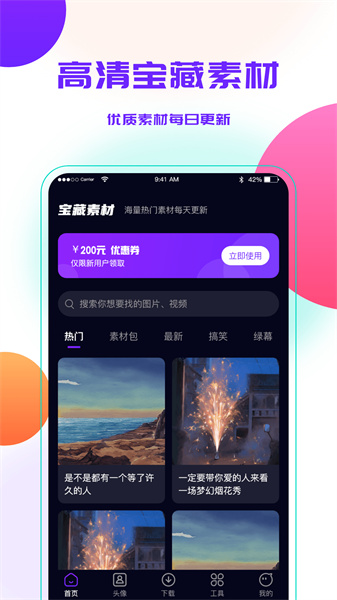 寶藏素材還提供實(shí)用小工具,免費(fèi)幫助用戶進(jìn)行無(wú)水印視頻下載,MD5修改,人聲分離,照片一鍵動(dòng)態(tài),人物一鍵微笑等操作。海量的頭像和壁紙一鍵下載功能更是讓用戶輕松獲取個(gè)性化素材。不論是制作作品還是個(gè)人需求,寶藏素材都會(huì)成為時(shí)間剪輯等內(nèi)容上的不可或缺的素材助手,如今也讓各種短視頻剪輯,提供了更全面的資源查找使用選擇。