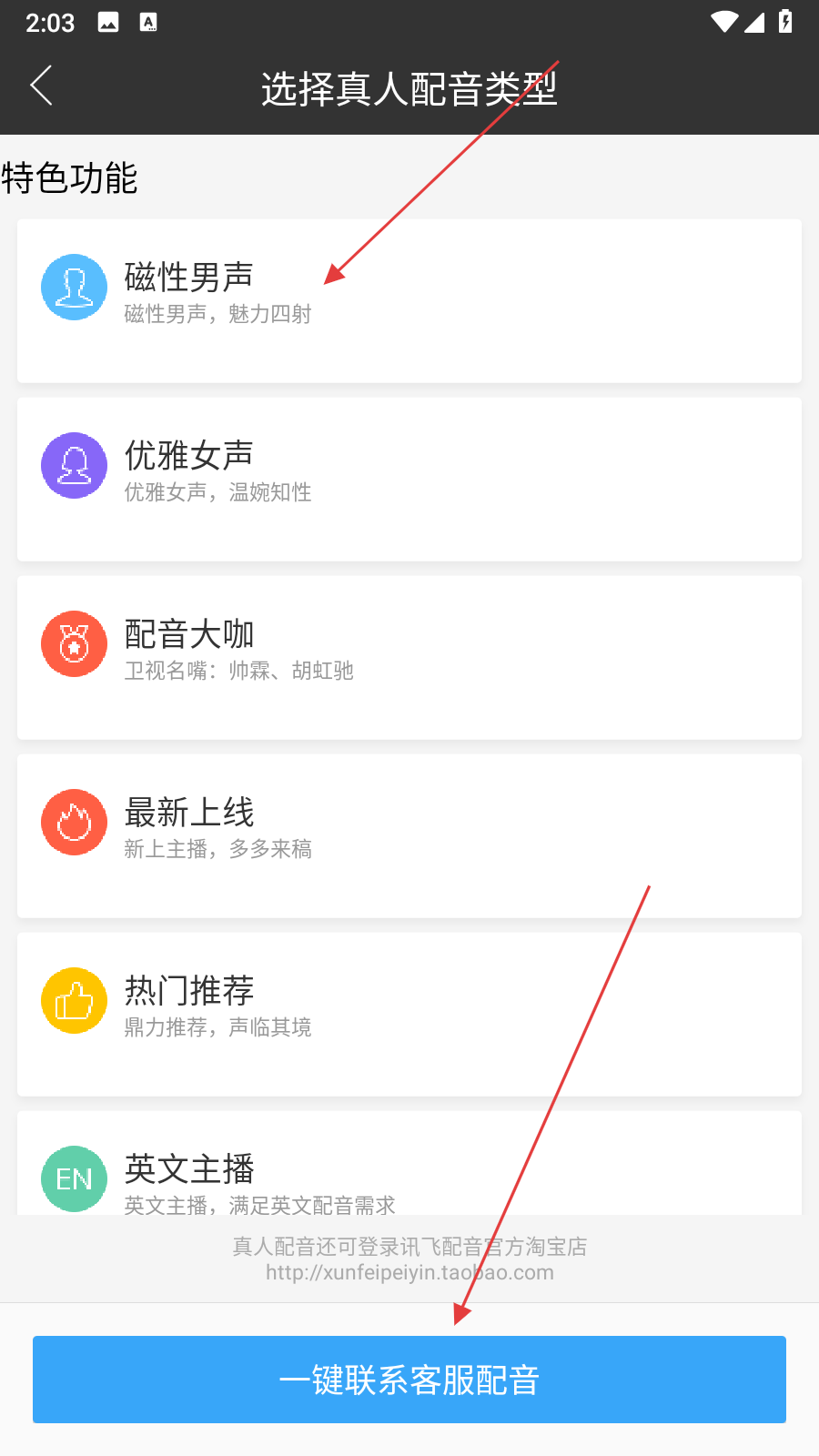 2、在真人配音類(lèi)型頁(yè)面,瀏覽磁性男聲、優(yōu)雅女聲等配音風(fēng)格,選定后點(diǎn)擊底一鍵聯(lián)系客服配音按鈕。