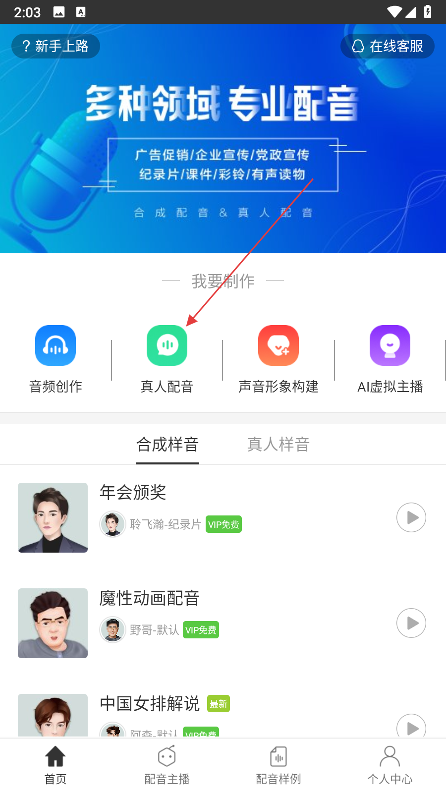 1、打開訊飛配音應用,在首頁我要制作板塊中點擊真人配音選項,進入真人配音類型選擇頁面。