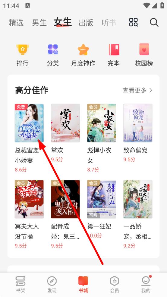 1、打開愛讀掌閱APP,點(diǎn)擊下方書城,找到想閱讀的書籍,比如點(diǎn)擊總裁蜜戀小嬌妻。