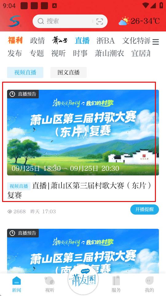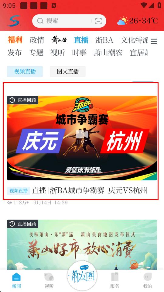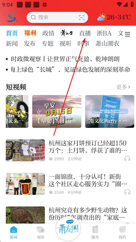 1、打開蕭山發(fā)布App,點擊頂部導(dǎo)航欄直播選項。