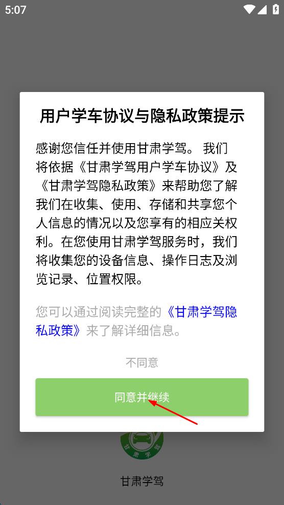 1、打開應(yīng)用,會彈出“用戶學(xué)車協(xié)議與隱私政策提示”頁面,仔細(xì)閱讀相關(guān)內(nèi)容后,點擊“同意并繼續(xù)”按鈕,進入應(yīng)用主界面。