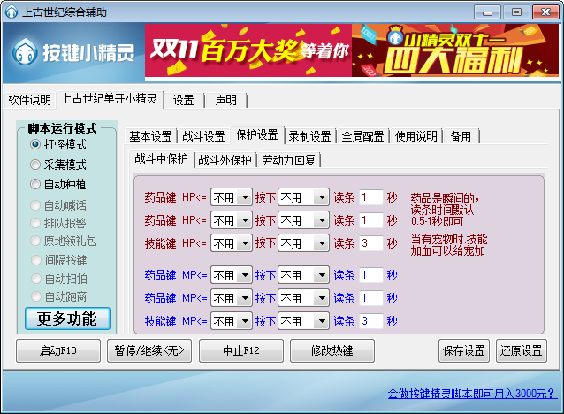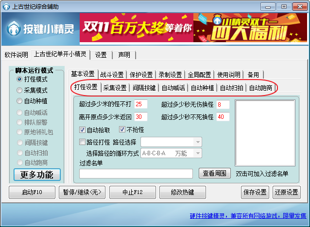 上古世紀(jì)綜合輔助是一款為游戲《上古世紀(jì)》打造的多功能輔助工具。軟件功能強(qiáng)大,為玩家提供自動(dòng)打怪、自動(dòng)跑商、自動(dòng)喊話、主動(dòng)尋怪、自動(dòng)領(lǐng)禮包等功能。全自動(dòng)尋怪和打怪,掛機(jī)必備神器!趕快下載體驗(yàn)吧!