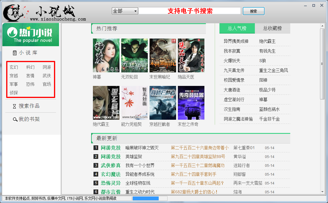 2、安裝完成后,打開小說城,這里有詳細、完整的分類列表,同時還支持電子書的搜索(起點、努努書坊、縱橫中文網(wǎng)、17K小說網(wǎng)、樂文網(wǎng)等)
