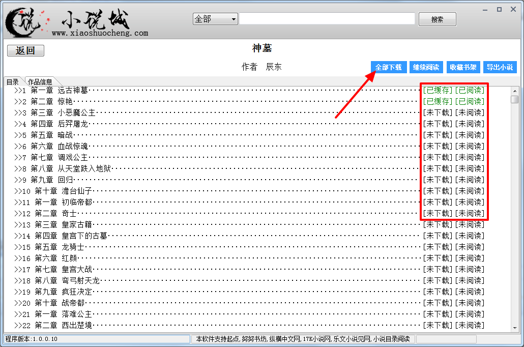 3、載入小說后,可以顯示電子書的閱讀狀態(tài),同時還可進行全集完結(jié)版的電子書下載