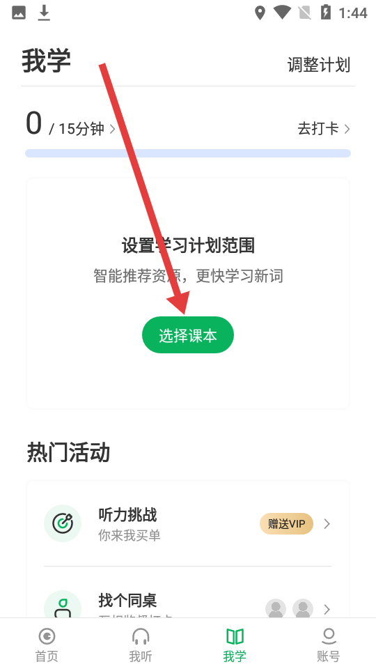 1、打開每日德語聽力APP,點擊底部我學(xué),再點擊選擇課本按鈕。