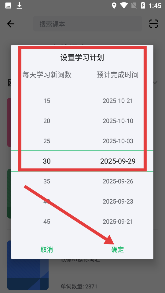 3、選擇具體課本后,設(shè)置每天學(xué)習(xí)新詞數(shù),點擊確定完成課本教材選擇。