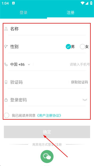 4、填寫名稱、性別、手機號,獲取并輸入驗證碼,設置登錄密碼,勾選協(xié)議,點擊確定。